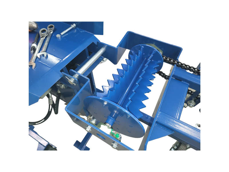 The hydraulic lift system raises logs to the ideal processing height, while the chain-driven feed wheels and conveyor rollers move logs smoothly into the processor chamber for consistent, controlled operation.